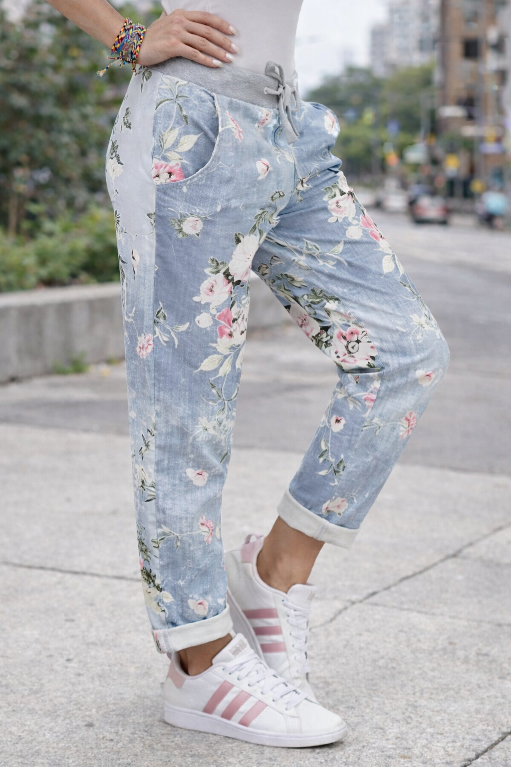 Der elastische Bund mit Bindeschleife sorgt für Komfort, während der Denim-Look Selbstbewusstsein ausstrahlt. Diese Hose ist für all jene, die nicht warten, bis alles perfekt ist – sondern dort aufblühen, wo sie stehen.